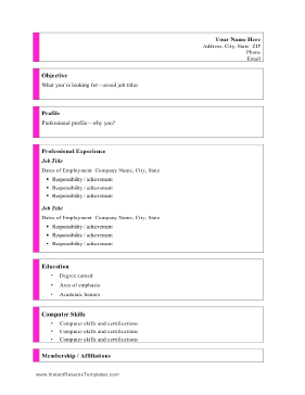 This pink-edged resume adds a feminine touch and is best used when applying for creative jobs.Match the set! Create a unified and professional application by pairing this resume with the matching cover letter here. More sample cover letters can be found at CoverLetterExamples.net.